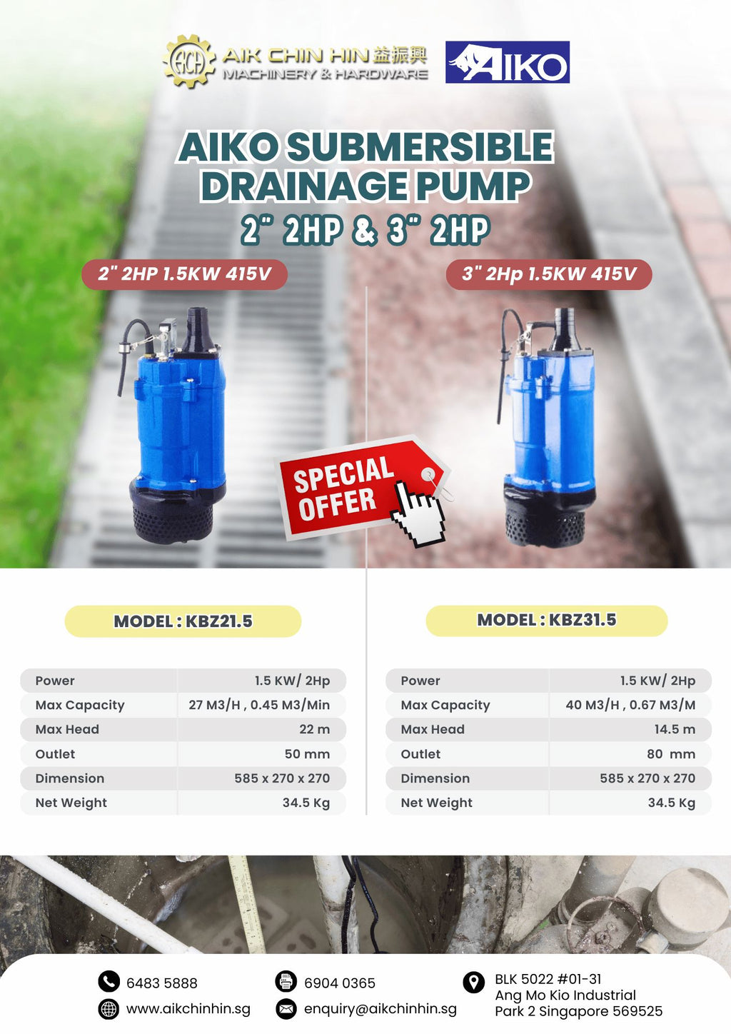 Aiko 4" 7.5Hp 5.5Kw 415V Submersible Drainage Pump | Model : KBZ45.5